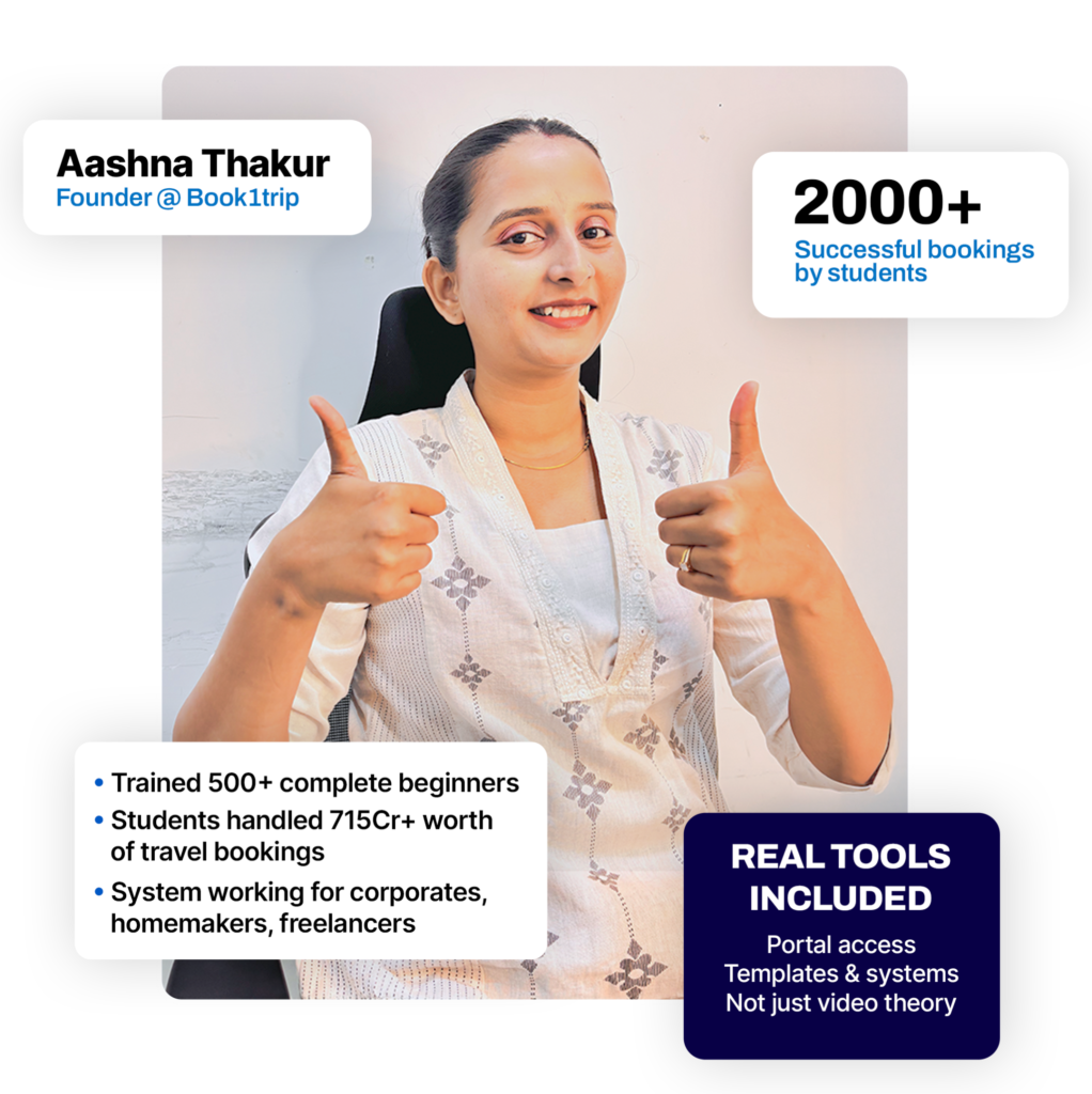 This is a beginner-friendly travel business course for anyone who wants to start earning from travel bookings and build consistent side income without leaving their current job or investing lakhs.
